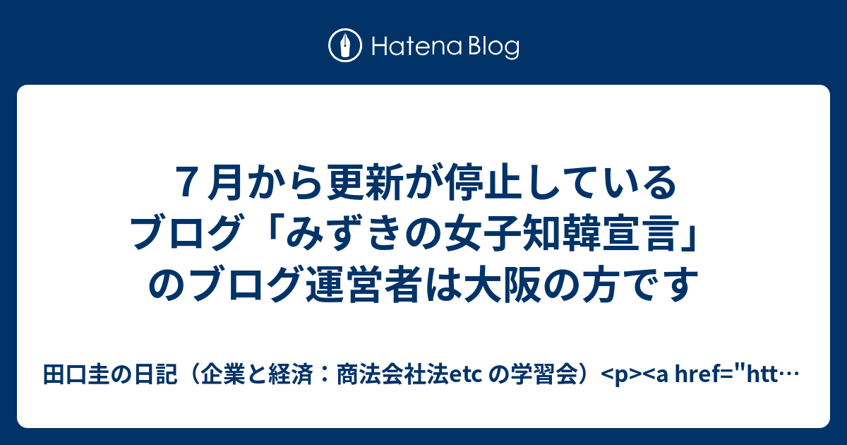 7月から更新が停止しているブログ みずきの女子知韓宣言 のブログ運営者は大阪の方です 田口圭の日記 企業と経済 商法会社法etc の学習会